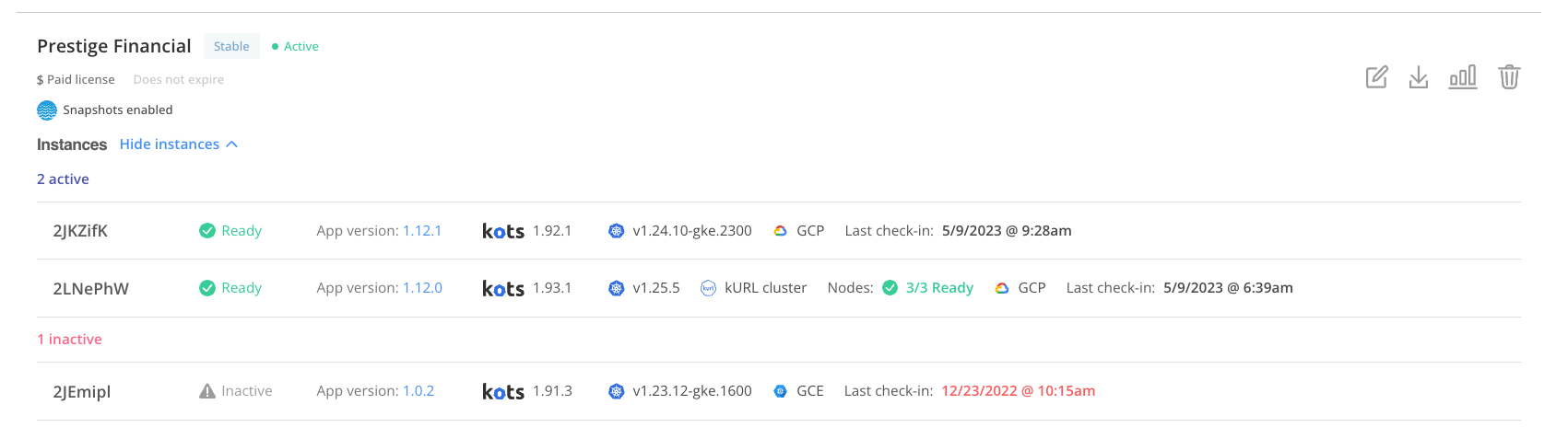 View instance details for each customer, including the version of the application that this instance is running, the Kubernetes distribution of the cluster, the last check-in time, and more: